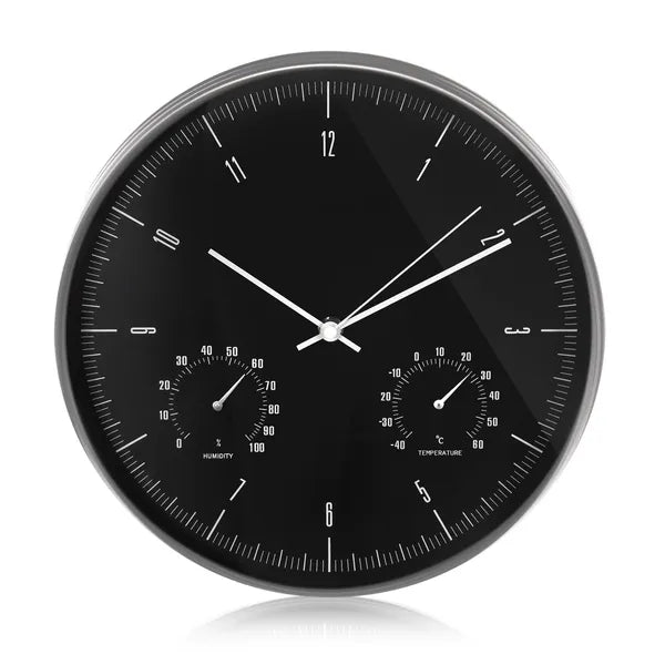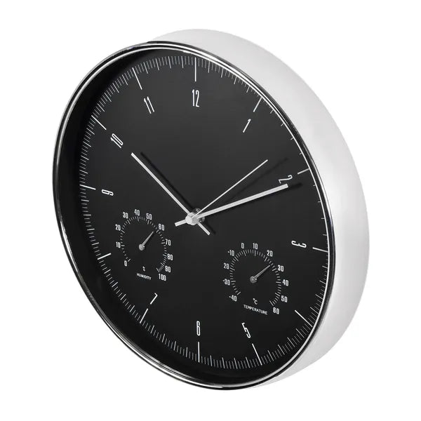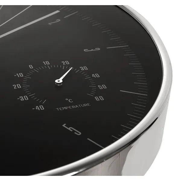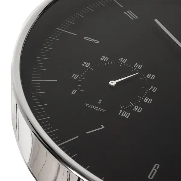 Az elegáns, 30 cm átmérőjű ezüst falióra nemcsak a pontos időt mutatja, hanem a beltéri hőmérsékletet és páratartalmat is jelzi, így egyszerre dísz és praktikus eszköz otthonában vagy irodájában. A halk, folyamatos járású kvarc szerkezetnek köszönhetően nem hallani zavaró ketyegést.
