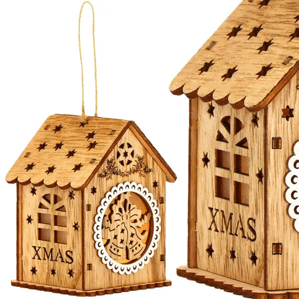 Hangulatos, fából készült karácsonyi házikó dísz meleg fehér LED-ekkel, amely tökéletesen illik a karácsonyfára, ablakpárkányra vagy asztaldísznek. A részletgazdag kivitel és a barátságos fény meghitt ünnepi atmoszférát teremt.