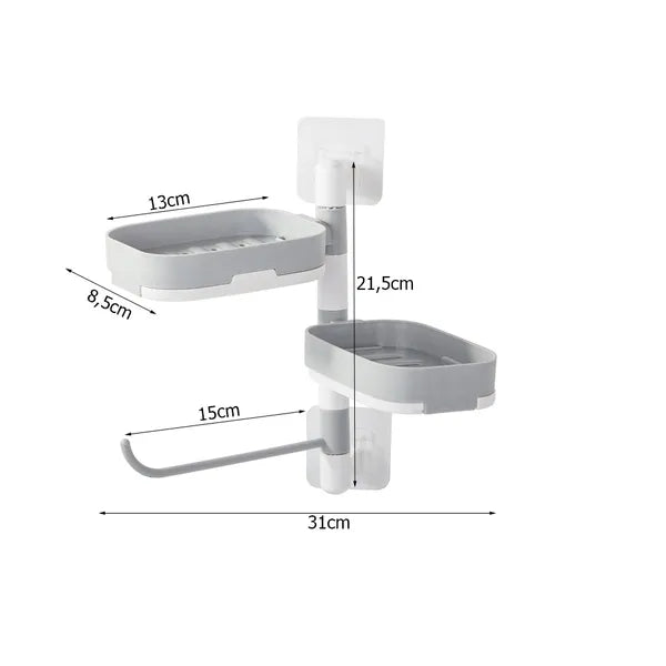 A falra szerelhető, tapadókorongos szappantartó két tálcával és praktikus törölközőtartóval gondoskodik a rendezett, higiénikus fürdőszobáról. A lecsöpögő víz külön tartályba gyűlik, így a szappan mindig száraz marad, a pult pedig tiszta.