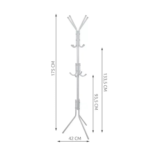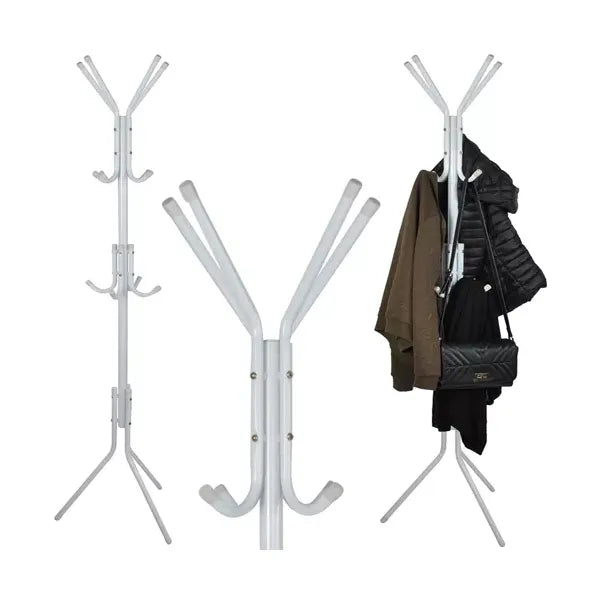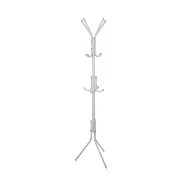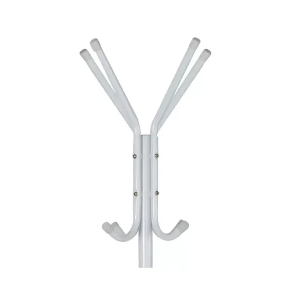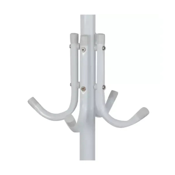Egyszerűen összeállítható, stabil álló ruhafogas fehér, porszórt fém kivitelben. 12 darab műanyag véggel borított kampója három szinten helyezkedik el, így kabátok, sálak, táskák és esernyők is elférnek rajta, miközben óvja a textíliákat a szakadástól.