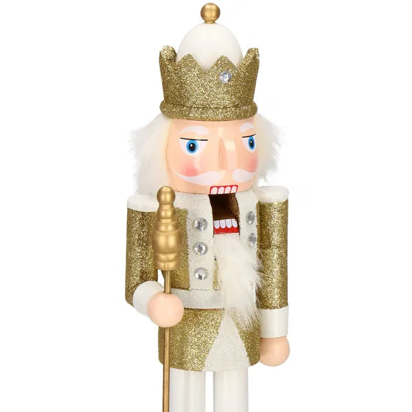 Egy klasszikus meséből ismert diótörő figura, amely elegáns fehér-arany színvilágával és csillogó cirkóniáival igazi ünnepi ragyogást kölcsönöz otthonodnak. A 38 cm magas, kézzel festett fa dekoráció stabil talpának köszönhetően biztonságosan elhelyezhető polcon, kandallópárkányon vagy az ünnepi asztal közepén. A hátoldali kar megemelésével a diótörő szája kinyílik, így a tradicionális funkcióját is megmutathatod vendégeidnek. Remek ajándékötlet karácsonyra, gyűjtőknek és a vintage stílus kedvelőinek.