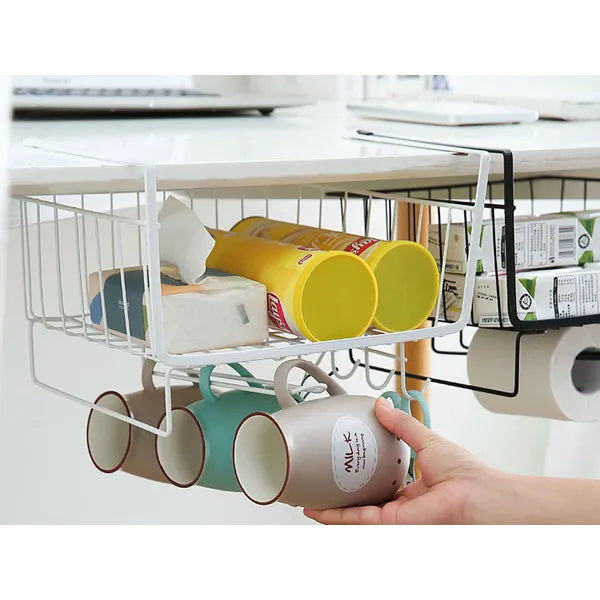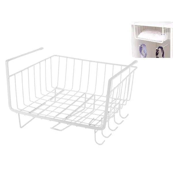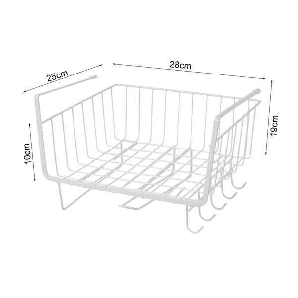 Szabadíts fel értékes munkafelületet a konyhában vagy a fürdőben ezzel a praktikus, fehér fém függő kosárral. A bútorlap alá egyszerűen felcsúsztatható, így fúrás és szerszám nélkül ad plusz 25×28 cm pakolófelületet.