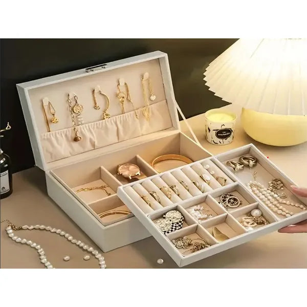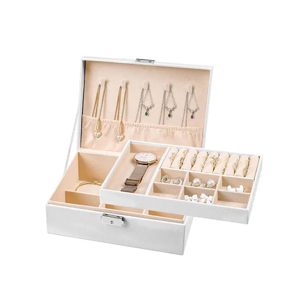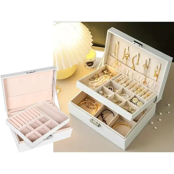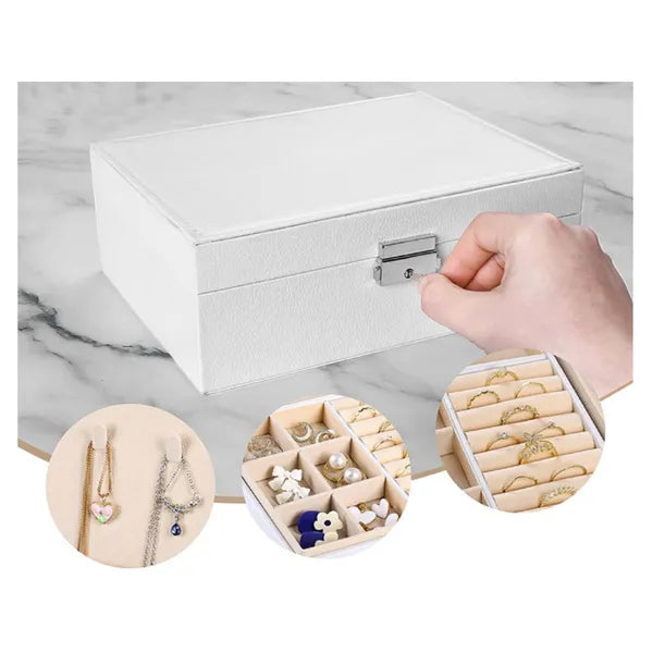 Rendezze és védje kedvenc ékszereit ezzel az elegáns, fehér műbőr ékszerdobozzal, amely nagy kapacitásának és átgondolt belső elrendezésének köszönhetően a gyűrűktől a karórákig mindennek biztonságos otthont nyújt.