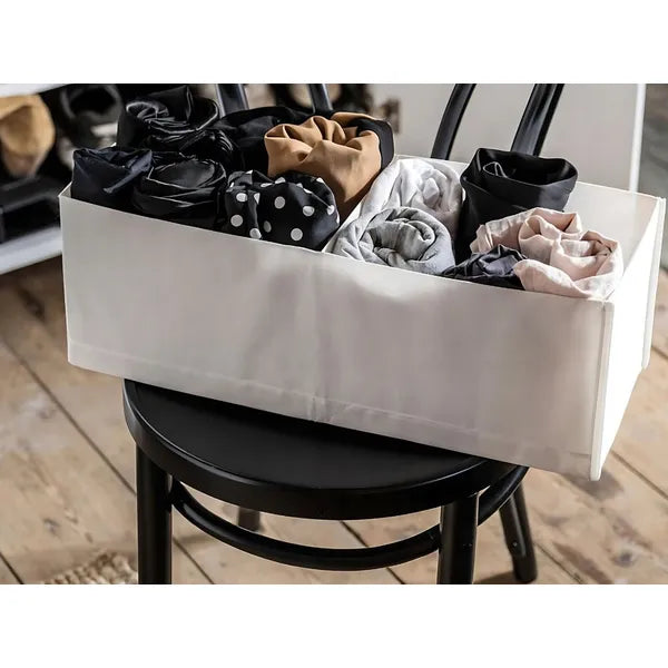 Rendezett fiókok, kevesebb idegeskedés: a fehér textil fiókrendező 20×34×10 cm méretben két tágas rekesszel gondoskodik az apró ruhadarabok átlátható tárolásáról.