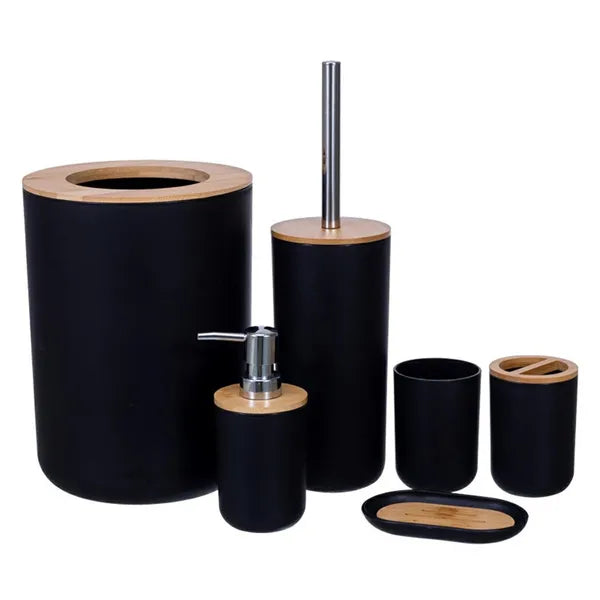 Fekete 6-részes polipropilén fürdőszobai kiegészítő szett bambusz fedéllel