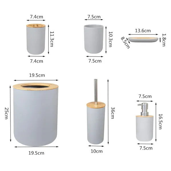 Vigyen elegáns, egységes megjelenést fürdőszobájába ezzel a 6 részes, fekete színű kiegészítő szettel, amely tartós polipropilénből készült, a szappanadagoló és a szemetes bambusz fedelével pedig természetes melegséget csempész a modern formavilágba.