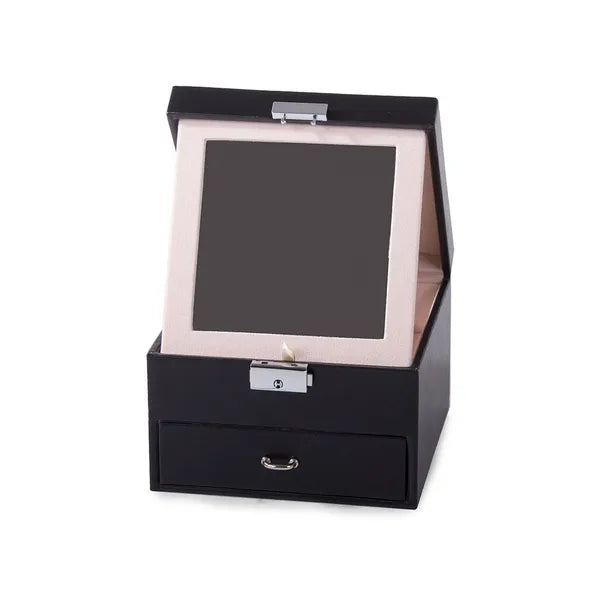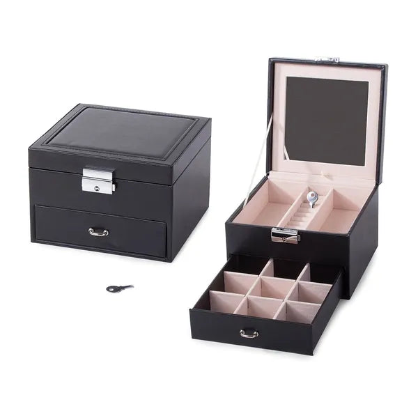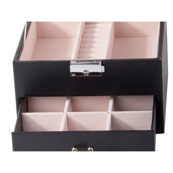 A fekete ékszerdoboz praktikus megoldás az ékszerek rendszerezésére otthon vagy utazáskor. Kompakt 16×16×11 cm-es méretéhez képest 12 különálló rekeszt, kihúzható fiókot, gyűrűtartót és beépített tükröt kínál, így minden gyűrű, lánc, fülbevaló és karkötő biztonságos helyet kap.