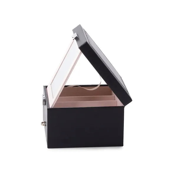 Fekete ékszerdoboz rendező, 12 rekesszel, tükörrel, kulccsal (16×16×11 cm)