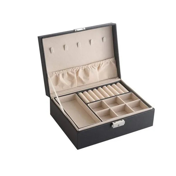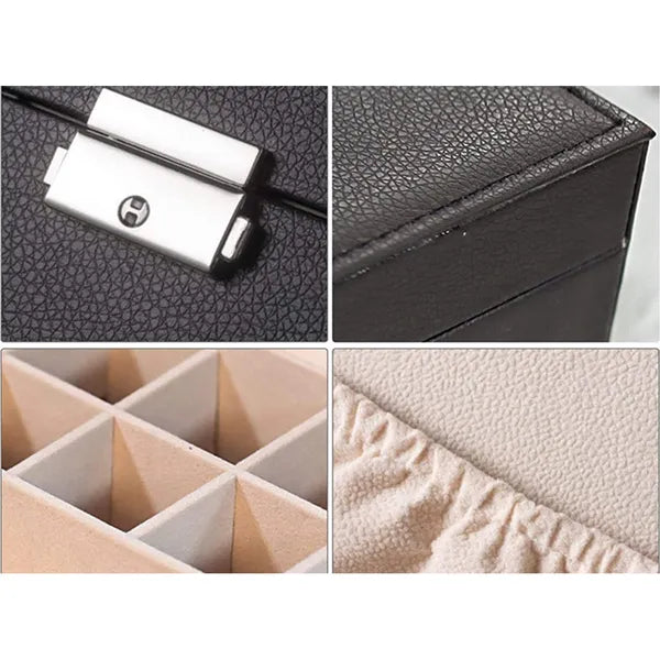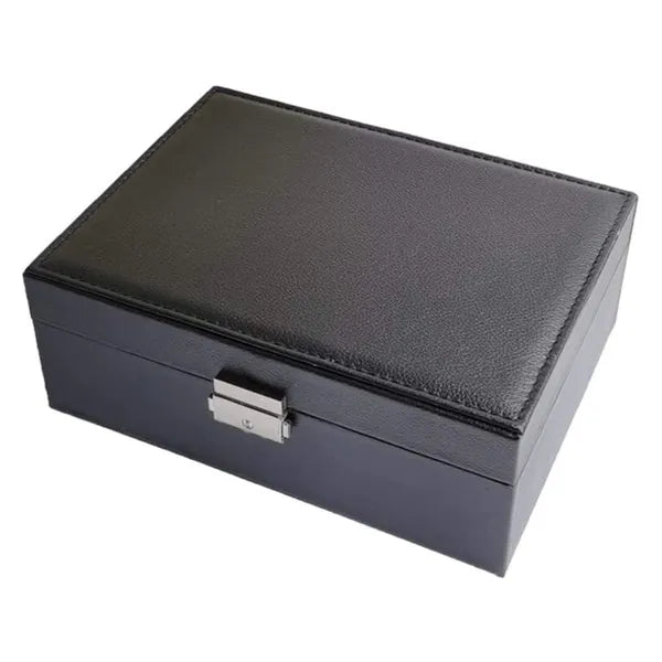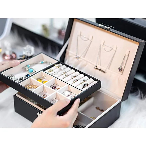 Egy elegáns, nagy kapacitású ékszertartó doboz fekete műbőr borítással és puha bársony belsővel, hogy minden kincsed biztonságban, karcmentesen és áttekinthetően legyen tárolva.