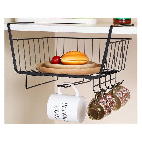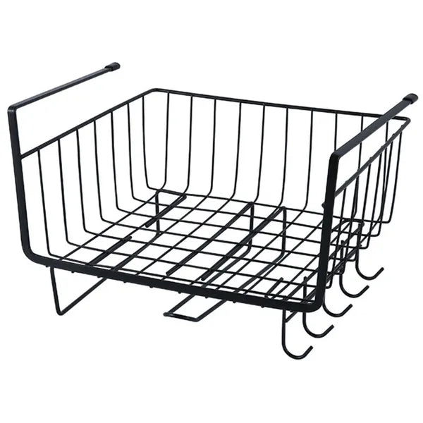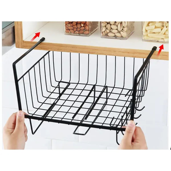 Viszlát zsúfolt szekrények! A polc alá csúsztatható, porszórt fekete fém kosár néhány másodperc alatt extra tárolófelületet ad a konyhában, a fürdőben vagy az irodában – fúrás, ragasztás nélkül.