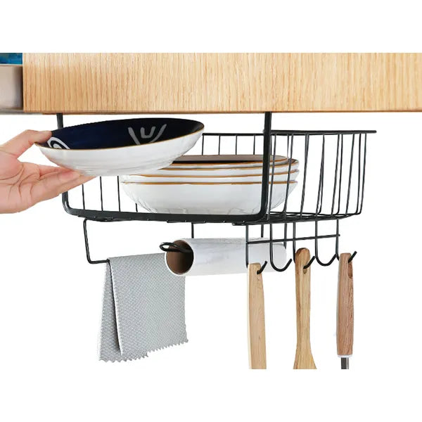 Fekete fém polc alatti függő kosár, papírtartó, 5 kampó, 28×25×19 cm