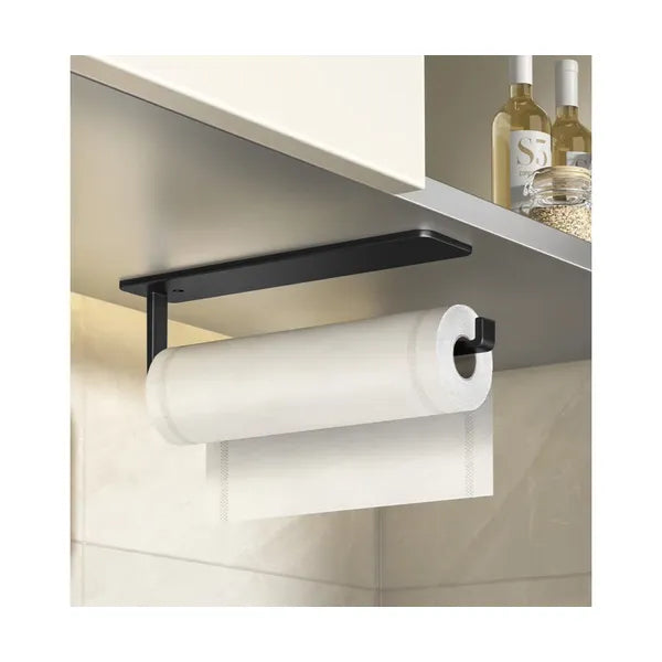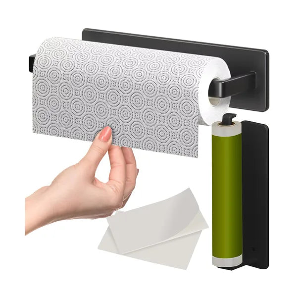 Kompakt, loft stílusú papírtörlő tartó, amelyet kétoldalas akril ragasztószalaggal rögzíthetsz a konyhafalra vagy a szekrény aljára, így nem kell fúrnod és port sem termelsz.