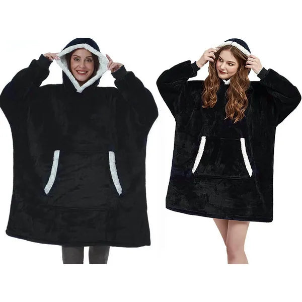 Fekete oversize XXL kapucnis takaró pulóver, pihe-puha teddy anyag