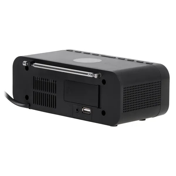 Fekete rádiós ébresztőóra vezeték nélküli 5W töltővel, Bluetooth FM