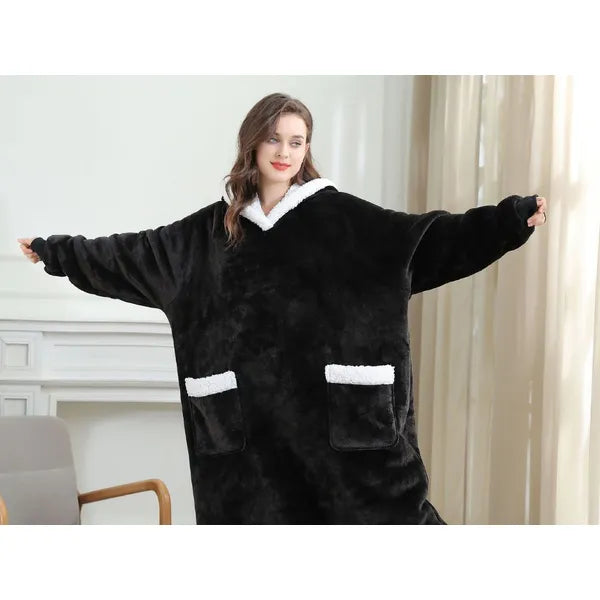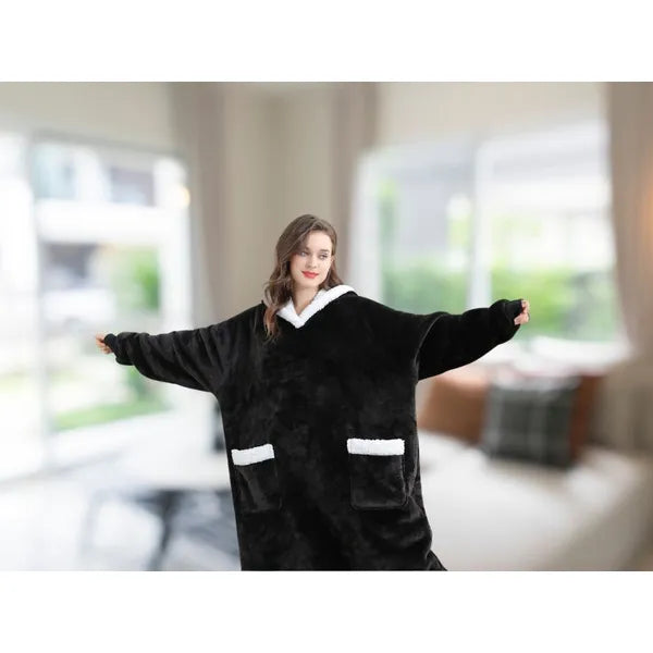 Otthon, kempingben vagy téli teraszozáshoz – ez a fekete, óriás kapucnis takaró pulóver minden helyzetben melegen tart. Vastag, 100% pamut anyaga selymesen puha, mégis jól szellőzik, hogy ne izzadj bele.