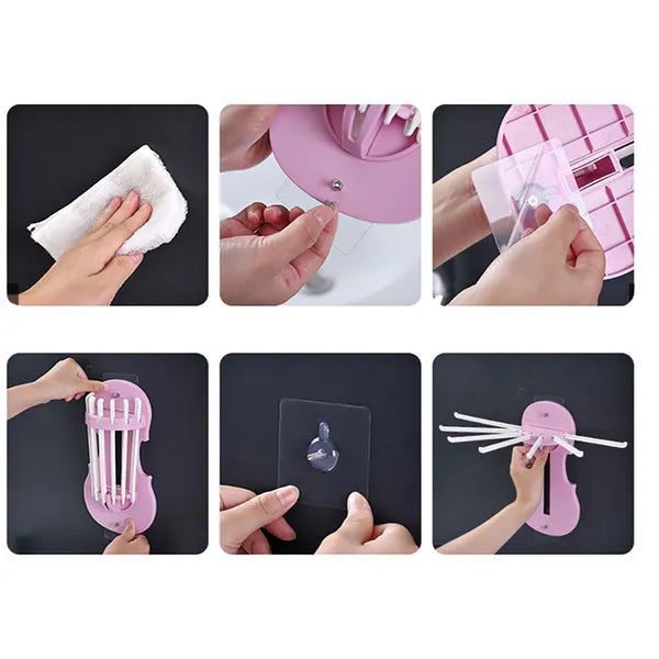 Szűk hely a fürdőben vagy a konyhában? A felcsukható, 7 karú törölköző- és eszköztartóval gyorsan rendet teremthetsz fúrás nélkül. A két erős, öntapadós rögzítőlap stabilan tartja a strapabíró, rózsaszín műanyag tartót, amely használaton kívül egyszerűen a falhoz simul.