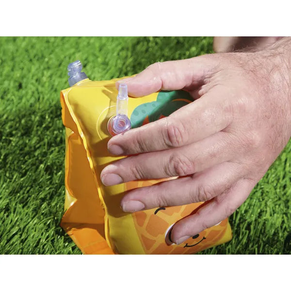 Használatkor csupán fújd fel mindkét kamrát, húzd a karokra, majd ellenőrizd, hogy szorosan, de kényelmesen illeszkedjen. A karúszó kizárólag sekély vízben, szülői felügyelet mellett használható, és nem helyettesíti az úszni tudást.