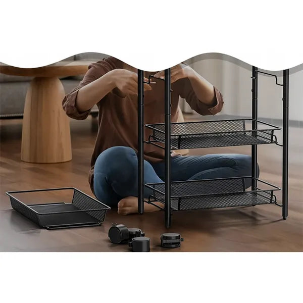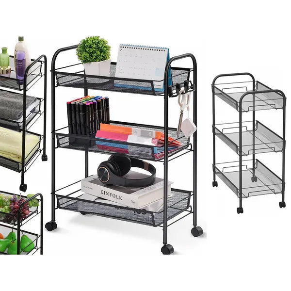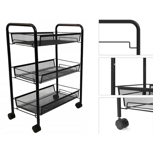 Praktikus, masszív fém tárolópolc három szinttel, melynek mindegyike hálós kialakítású, így nem gyűlik össze a víz vagy a morzsa. A keskeny (mindössze 27 cm mély) állvány kerekeken gurul, a két fékkel ellátott első kerék pedig biztosítja, hogy használat közben stabilan a helyén maradjon.