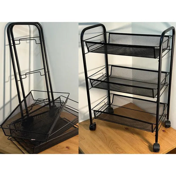 Fém guruló polcos állvány, 3 szintes, 64×44×27 cm, fekete