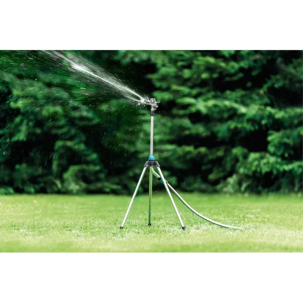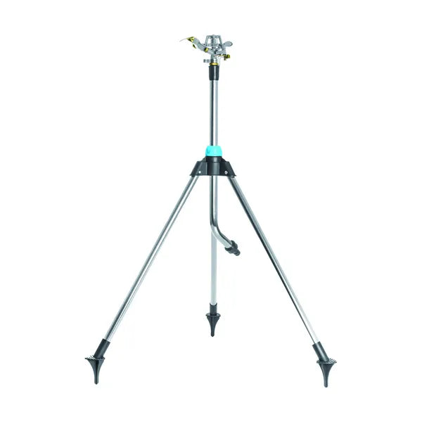 Professzionális, acéltestű impulzusos locsoló, amely állítható háromlábú állványon biztosít precíz öntözést még nagy kertekben is.