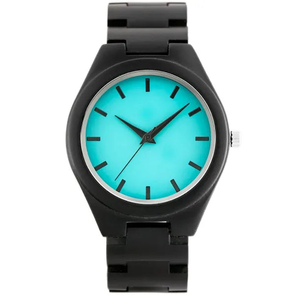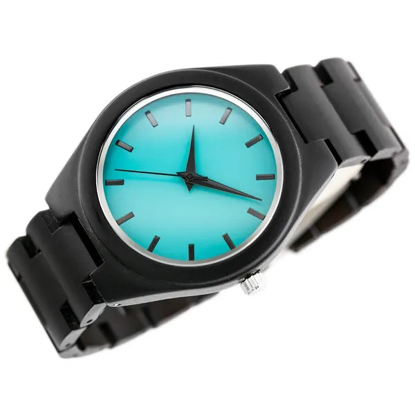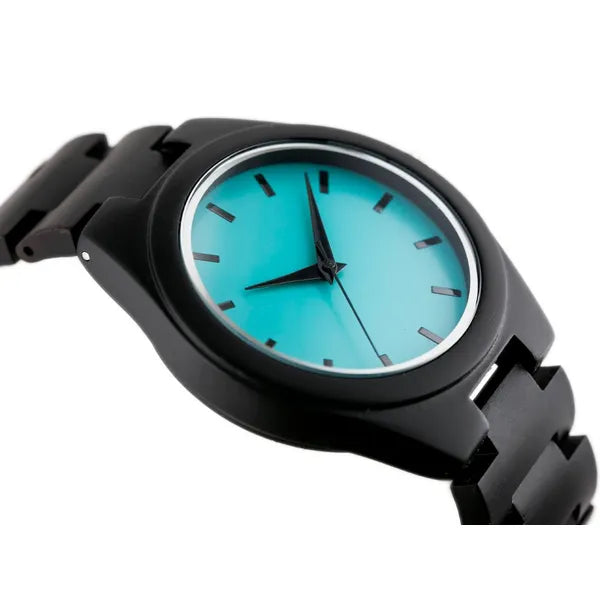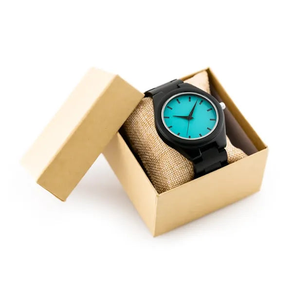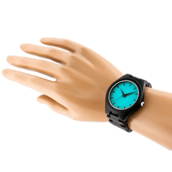 Férfi fa karóra kvarc szerkezettel, türkiz számlappal, WR30