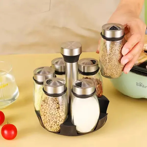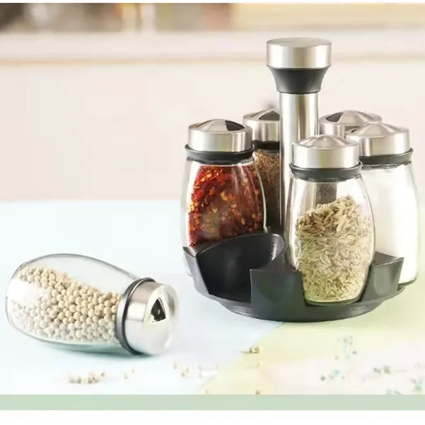 Forgatható fűszertartó állvány 6 üveg edénnyel, 120 ml, rozsdamentes acél