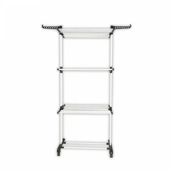 A Herzberg HG-8034BW gurítható ruhaszárító állvány praktikus megoldás, ha kevés a hely, mégis sok ruhát kell egyszerre szárítani vagy rendszerezni. Porszórt acélváza és erős ABS műanyag kötések gondoskodnak a korrózióállóságról és a hosszú élettartamról. Hat lehajtható polcán és a két szárnyas akasztórészen akár egész családi adag ruhát is elhelyezhet, miközben a 14 oldalsó vállfatartó nyílás szellős elrendezést biztosít.