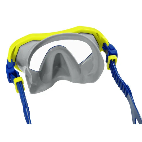 A gyerek búvárszett maszkból, snorkelből és állítható uszonyból áll, hogy a 7 évnél idősebb felfedezők biztonságban élvezhessék a víz alatti világot. A rugalmas szilikontömítés és a törésálló, UV-szűrős polikarbonát lencsék kényelmes illeszkedést és tiszta látóteret nyújtanak, míg a fröccsenésgátlóval és ürítőszeleppel ellátott légzőcső megkönnyíti a légzést.