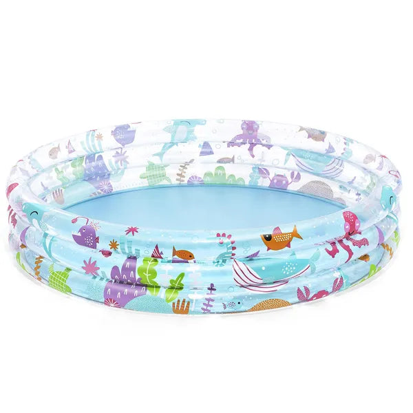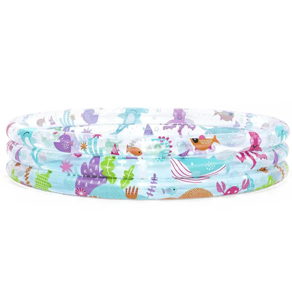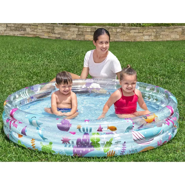 Forró nyári napokon nincs jobb, mint egy saját, biztonságos pancsoló a kertben. A 152 cm átmérőjű, 30 cm magas, tengeri állatmintás gyerekmedence erős PVC-ből készült, három külön felfújható gyűrűje pedig stabil keretet ad a vízi mókához.