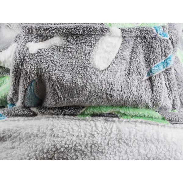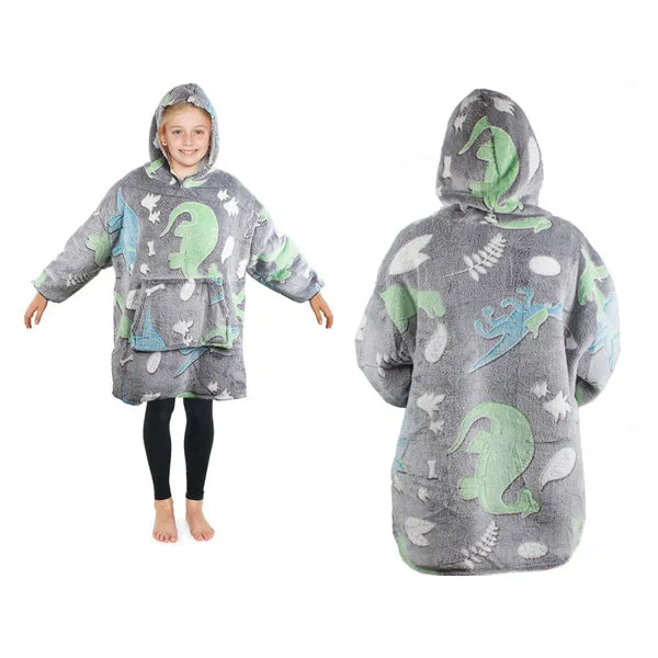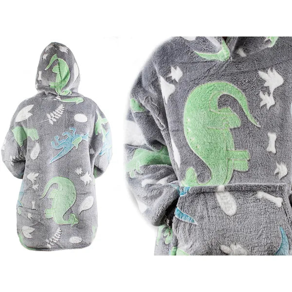 Álmodozóan puha, plüss belsővel bélelt, meleg kapucnis takaró-pulóver, amely egyesíti a takaró kényelmét és a pulóver szabadságát. A sötétben fluoreszkáló dinoszaurusz mintának köszönhetően a gyerekek játékosan élhetik át az esti meséket, miközben kellemesen melegen maradnak a tévé előtt, a teraszon vagy kempingezéskor.