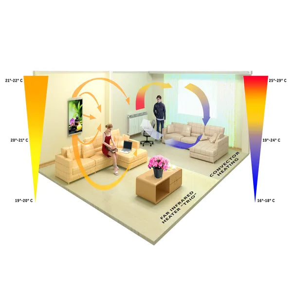 - Csendes, egészséges működés: nem keringeti a port, nem szárítja a levegőt, a hő közvetlenül a tárgyakat és a testet melegíti.