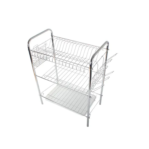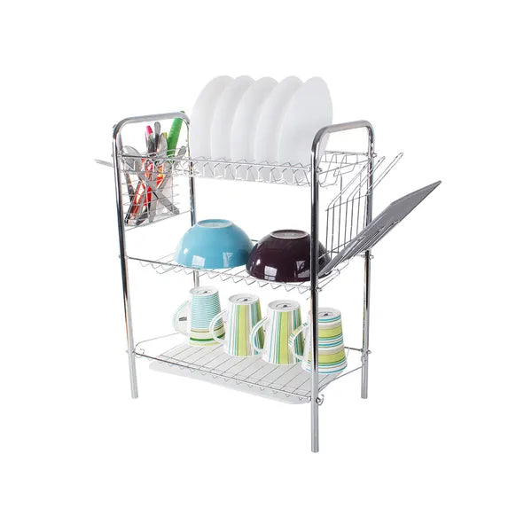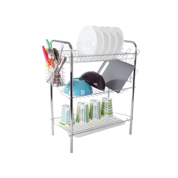 Kompakt, mégis nagy kapacitású, háromszintes edényszárító, amely megkönnyíti a mosogatás utáni rendrakást. Masszív fém váza ezüst bevonattal ellenáll a rozsdának, míg a levehető műanyag csepegtetőtálca felfogja a vizet, így a munkapult száraz marad.