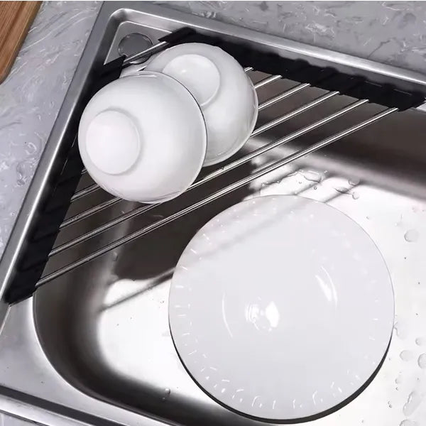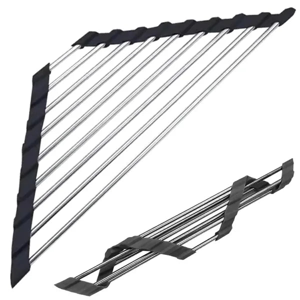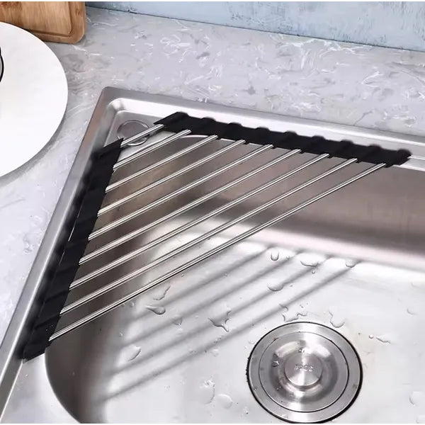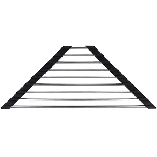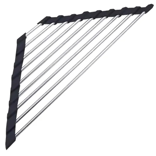 Space-takarékos megoldás minden konyhába: a háromszög alakú, feltekerhető csepegtető 9 darab sűrűn elhelyezett rozsdamentes acél rúddal biztosítja a tányérok, poharak és zöldségek gyors lecsöpögését. A puha, hőálló szilikon perem szilárdan illeszkedik a mosogató peremére, nem csúszik el, és védi a felületet a karcolódástól.