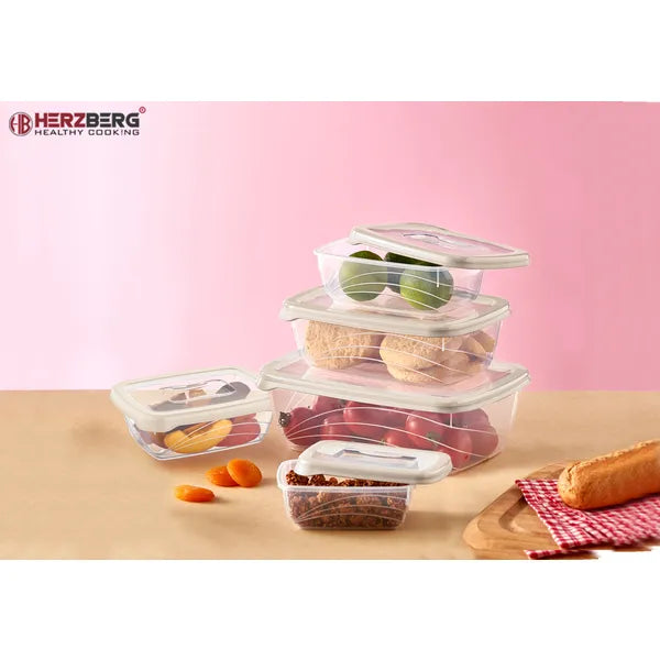 A Herzberg 5 részes Bio Saver ételtároló szett praktikus és higiénikus megoldást kínál a mindennapi konyhai tárolási feladatokhoz. A különböző méretű dobozok egymásba helyezhetők, így helyet takarítanak meg a szekrényben, a prémium, BPA-mentes anyag és a szilikon tömítés pedig gondoskodik arról, hogy az ételek hosszabb ideig frissek maradjanak.