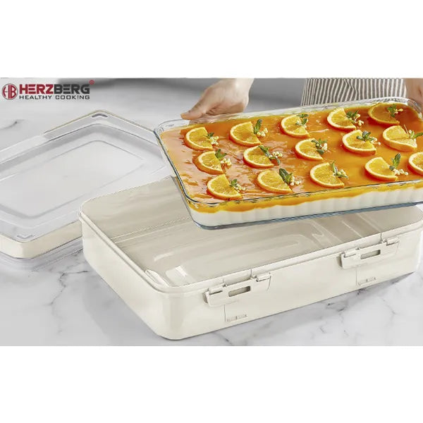 A Herzberg egyszintes süteményszállító doboz megbízható megoldás torták, piték, muffinok vagy bármilyen házi sütemény higiénikus tárolására és biztonságos szállítására. Tágas 42×30×11 cm-es belső tere védi a finom díszítéseket, a légmentesen záródó fedél és a masszív retesz pedig megakadályozza a kifolyást, felborulást.