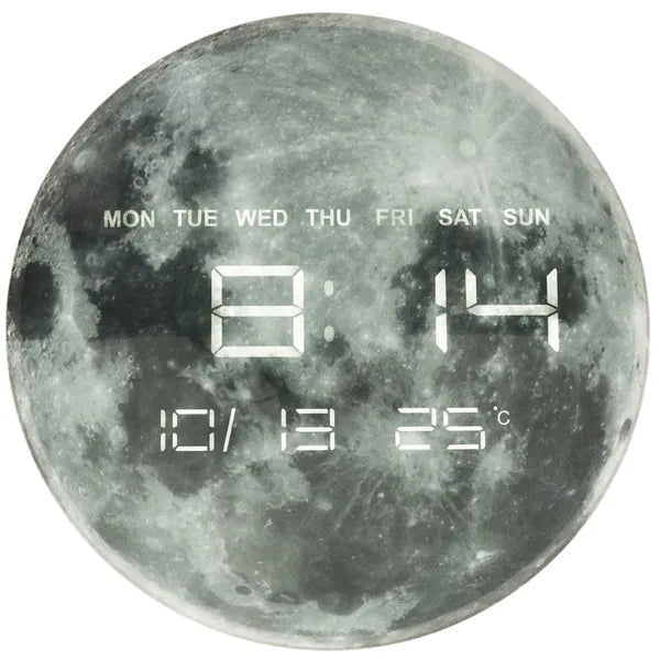 Szeretnél egy különleges, mégis praktikus kiegészítőt a nappalidba vagy irodádba? A holdfelszínt idéző, 32 cm átmérőjű falióra LED kijelzővel nemcsak pontos időt jelez, hanem dátumot, a hét napját és a szoba hőmérsékletét is megmutatja.