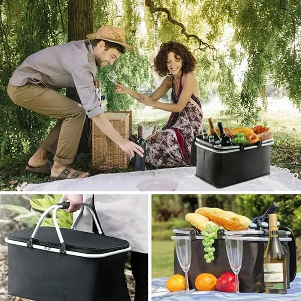 Hőszigetelt összecsukható piknikkosár, fekete, 47,5x28x22 cm