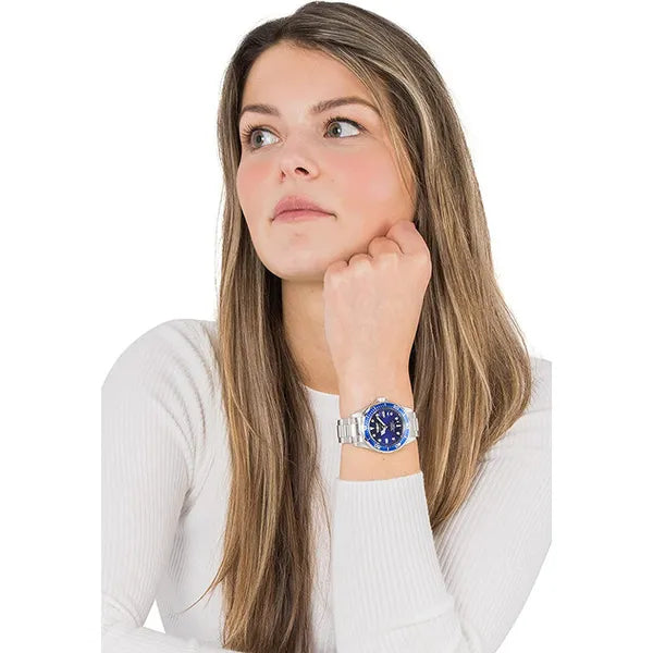 Erőteljes, Tritnite bevonatú mutatók és indexek teszik egyszerűvé az idő leolvasását gyenge fényviszonyok között is. A kék számlap fölött elhelyezkedő dátumablak nagyítóval kiemeli a hónap napját, az ásványi üveg pedig ellenáll a napi igénybevételnek.