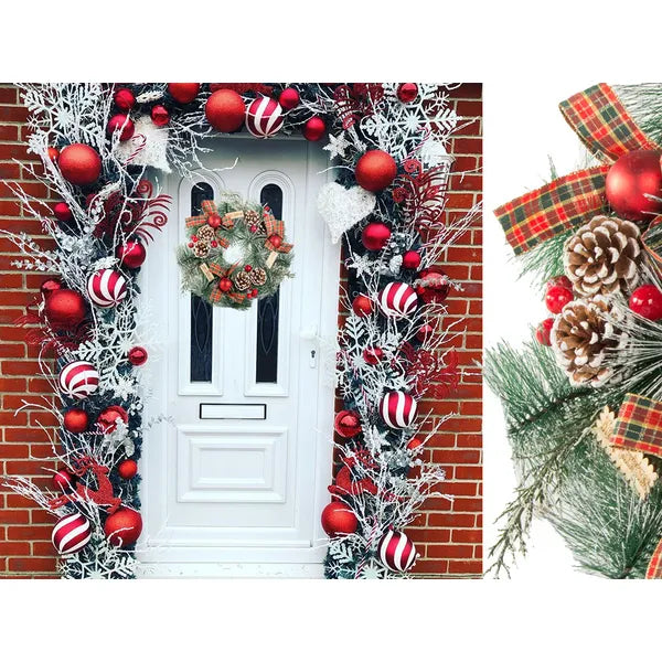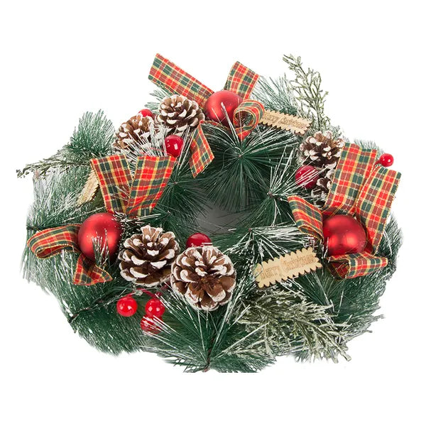 Varázsolj igazi ünnepi hangulatot otthonodba ezzel a prémium, 30 cm átmérőjű karácsonyi koszorúval, amely örökzöld hatású műfenyő ágakból, valódi tobozokból és csillogó díszgömbökből áll.