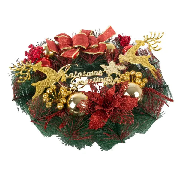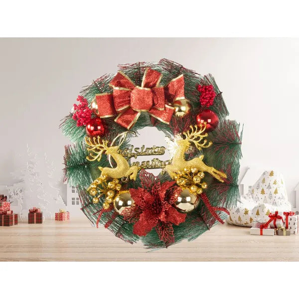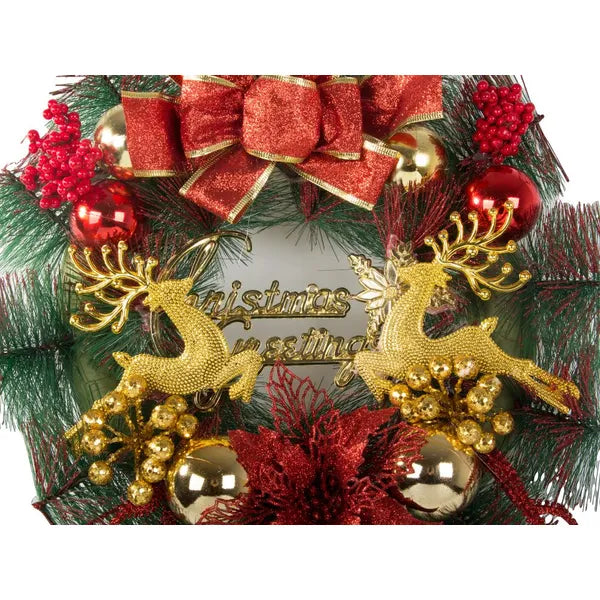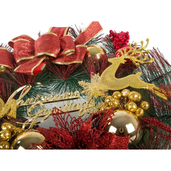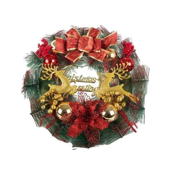 Varázsolj igazi ünnepi hangulatot otthonodba ezzel a 30 cm-es, gazdagon díszített karácsonyi koszorúval, amely műfenyő ágakból készült és ragyogó gömbökkel, tobozokkal, virágokkal, rénszarvassal, valamint „Merry Christmas” felirattal teszi még különlegesebbé a dekorációt.