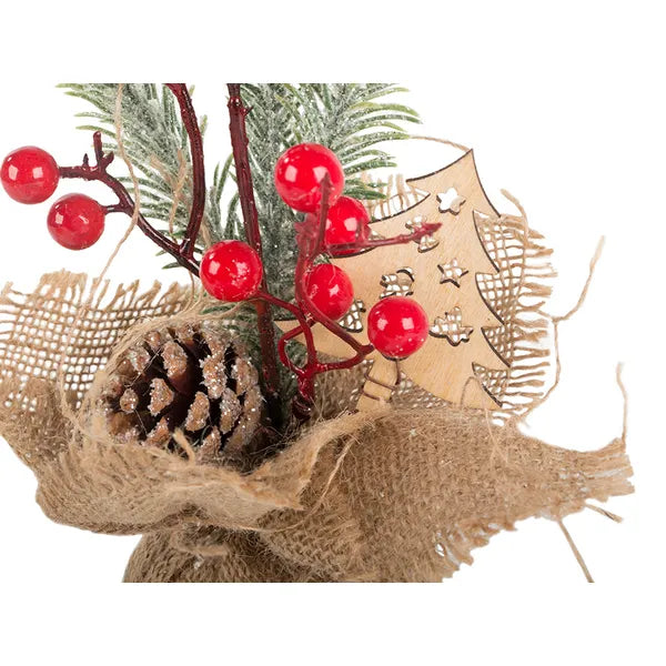 Engedd, hogy ez a gondosan összeállított, 27 cm magas karácsonyi asztaldísz piros bogyóival, tobozaival és natúr juta borításával meghitt, rusztikus légkört teremtsen otthonodban.