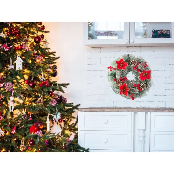 Varázsolj ünnepi hangulatot otthonodba ezzel a természetes tobozokkal és csillogó díszekkel ékesített, 20 cm átmérőjű karácsonyi koszorúval! A könnyű, stabil alapnak köszönhetően egyszerűen felakaszthatod bejárati ajtóra, falra vagy akár az ablakba is.