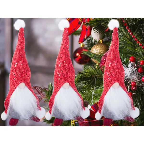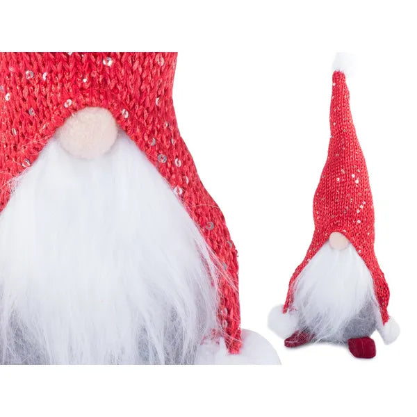 Karácsonyi manó dekoráció 30 cm, piros-szürke csillámos, hajlítható sapkával