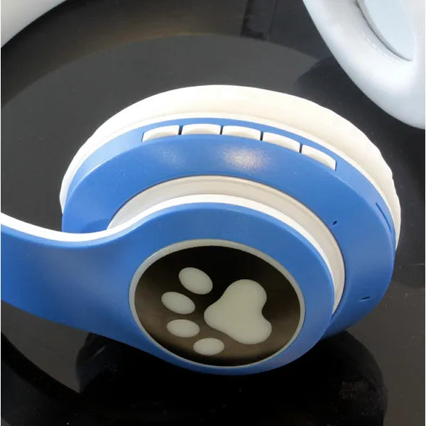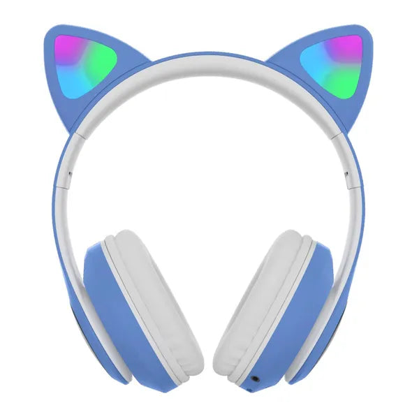 Kék Bluetooth 5.0 gyerek fejhallgató LED-es cica fülekkel, microSD, FM