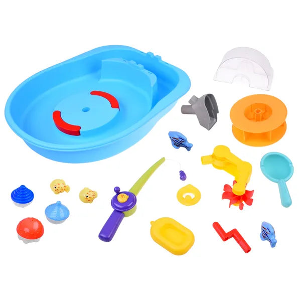 A doboz tartalma: kék medence, vízikerék, vízlejtő, 3 öntőedény, 4 halacska, forgó horgásztó, műanyag horgászbot orsóval, csónak, kacsa alakú tutaj.