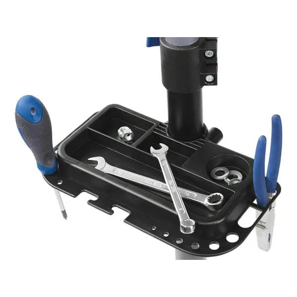 Az állítható kar gumírozott pofákkal 25–40 mm átmérőjű vázakat fog biztonságosan, a 110–190 cm állítható magasság és a döntési szög segítségével pedig mindig ergonomikus pozícióban dolgozhatsz. A mágneses szerszámtartó tálca és a kormányrögzítő a precíz munkát támogatja, így a fék- és váltóbeállítás, lánckenés vagy kerékcsere gyorsabb és tisztább lesz.