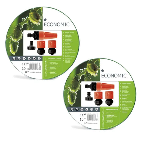 Az Economic kerti locsoló szett mindent tartalmaz, amire a gyors és hatékony öntözéshez szükség lehet. A 20 m-es, 1/2″ méretű, 3 rétegű tömlő ellenáll az UV-sugaraknak és megakadályozza az algaképződést, így hosszú élettartamot biztosít. A készlethez tartozó egyszerű szórófej két vízsugár-beállítással (pára és erős pontsugár) gondoskodik a palánták óvatos permetezéséről vagy a makacs szennyeződések lemosásáról.