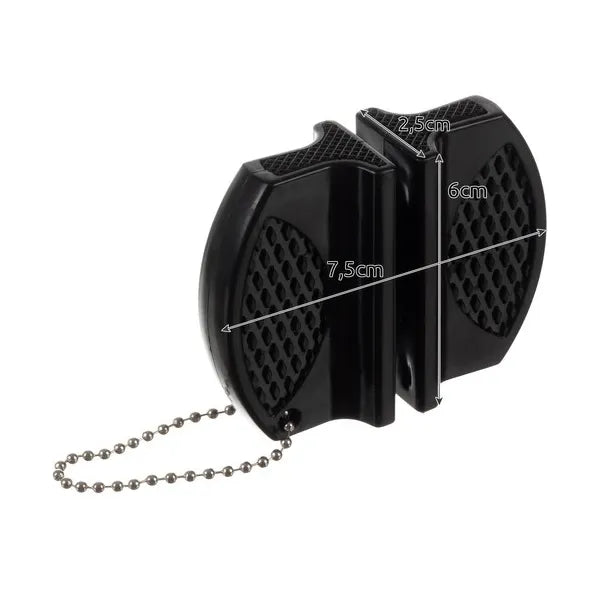 Kétszakaszos volfrám-kerámia késélező lánccal, 7,6 × 5,8 cm, fekete