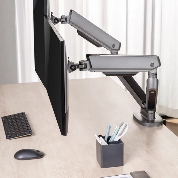 A masszív acélkarok egyenként 9 kg teherbírásúak, a kétféle rögzítési opció pedig gyors beépítést tesz lehetővé: szorítós bilincs a lapra vagy csavar a kábelátvezető furatba. A beépített kábelrendezővel az asztal rendezett marad, míg a +40°/-40° dőléstartomány, a teljes elfordulás és a magasságállítás gondoskodik az optimális testtartásról.
