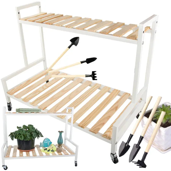 Kétszintes fa virágtartó polc kerekeken, 80×40×44 cm, mini szerszámszettel